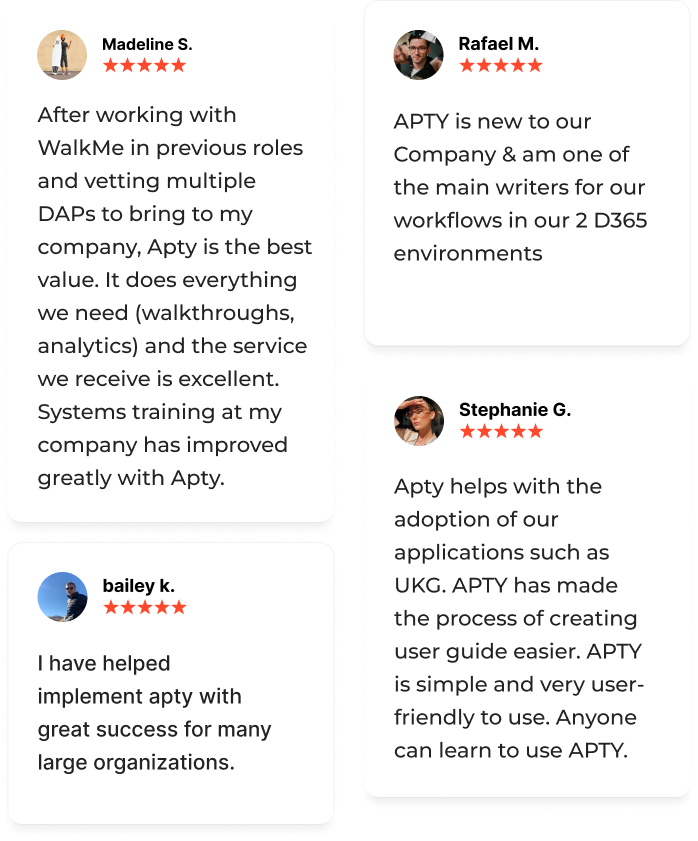 Don’t wait months to see value. Apty’s in-app guidance and automation deliver productivity gains from day one, cutting onboarding time in half.